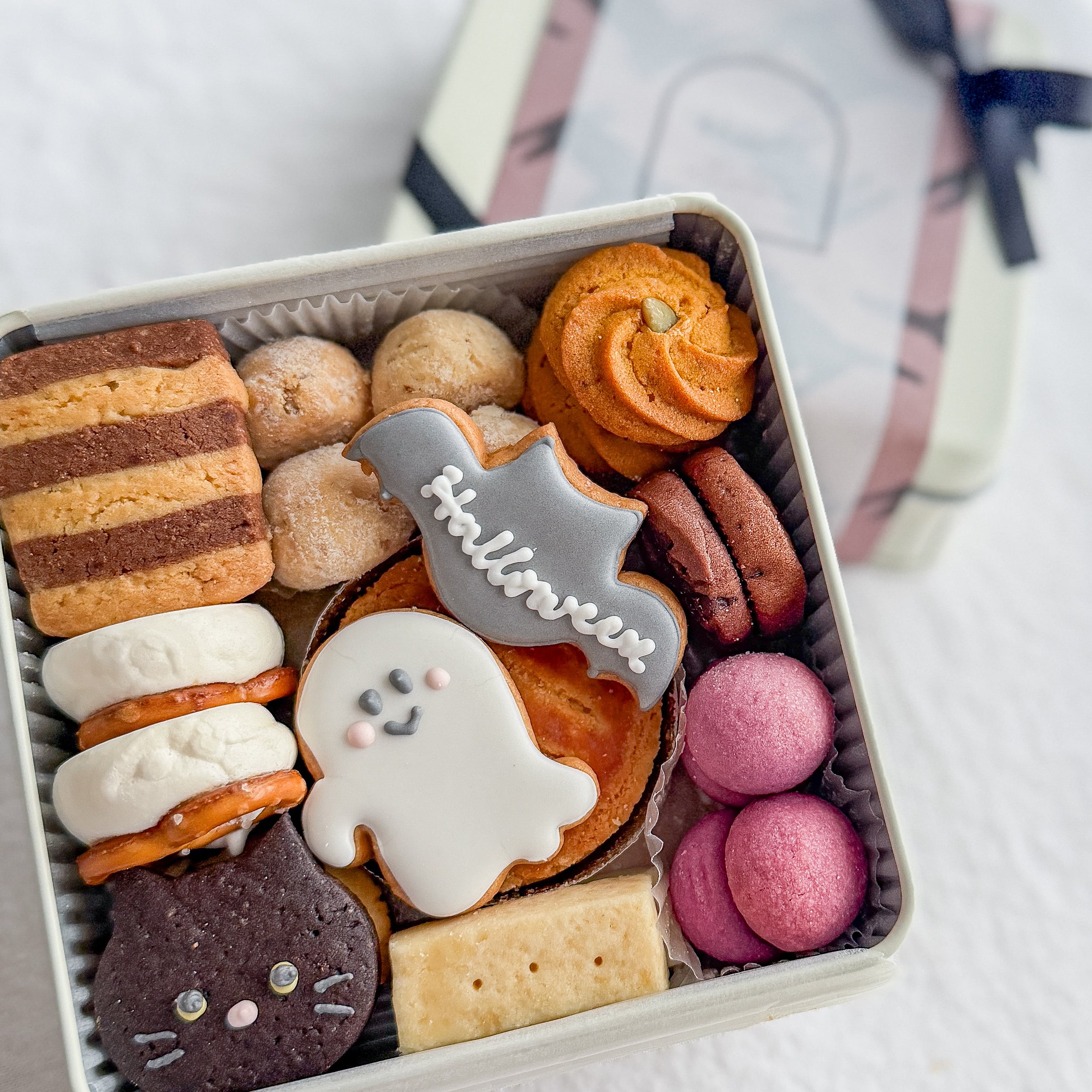 おばけ、コウモリ、黒猫の愛らしいアイシングクッキーが詰め込まれており、ハロウィンの雰囲気を存分にお楽しみいただけます。