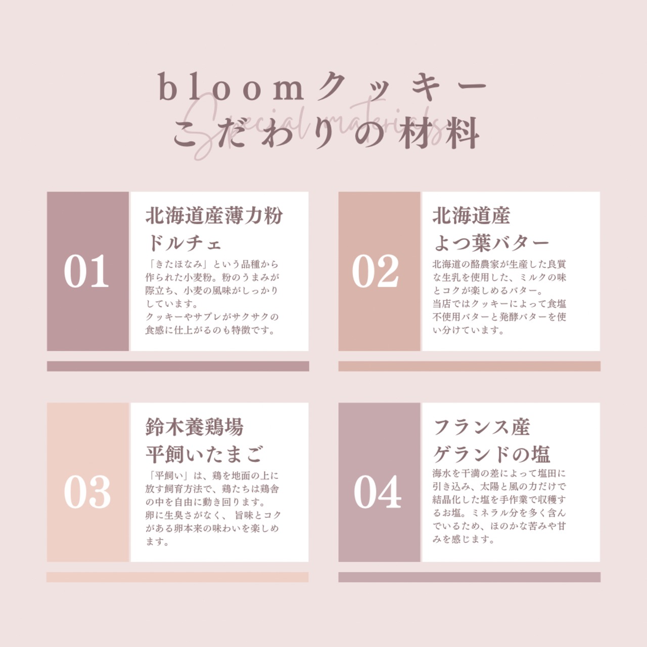 【原材料】 小麦粉(国内製造)、無塩バター、鶏卵、てんさい糖、粉糖、アーモンドプードル、チョコチップ、ハチミツ、ココア、抹茶、いちごジャム、ホワイトチョコ、フリーズドライストロベリーダイス、レモン果汁、スパイスミックス、重曹、塩/ベーキングパウダー、バニラエクストラクト、着色料(竹炭パウダー、抹茶、ココア、紅麹色素、クチナシ色素)